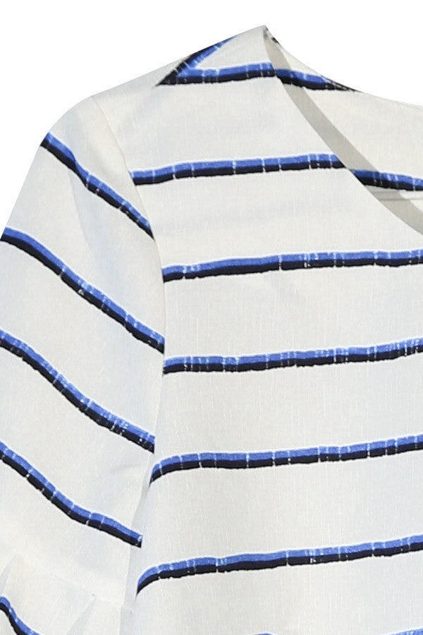 Dáng áo croptop luôn cho thấy ưu điểm vượt trội của nó khi kết hợp trang phục. Thiết kế áo croptop có phần tay bồng lạ mắt cùng đường kẻ ngang hút mắt, nữ tính.