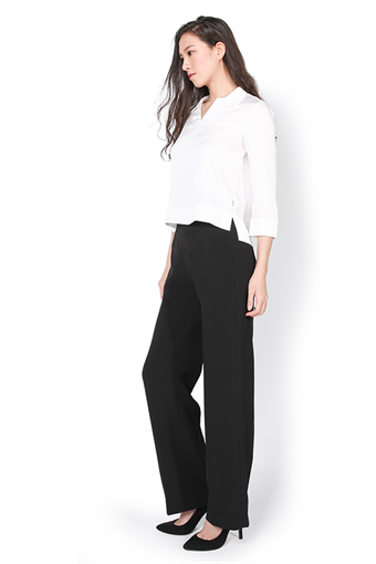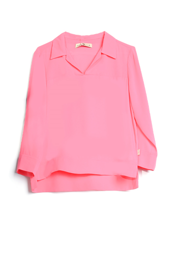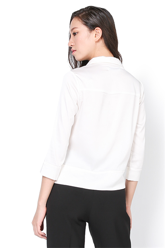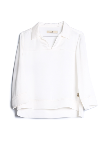 Áo sơ mi trơn chất liệu chiffon nhẹ, mát, thích hợp cho tiết trời thu. Vạt áo high-low đã phá bỏ vẻ cứng nhắc vốn có của áo sơ mi truyền thống để mang lại vẻ trẻ trung, năng động.