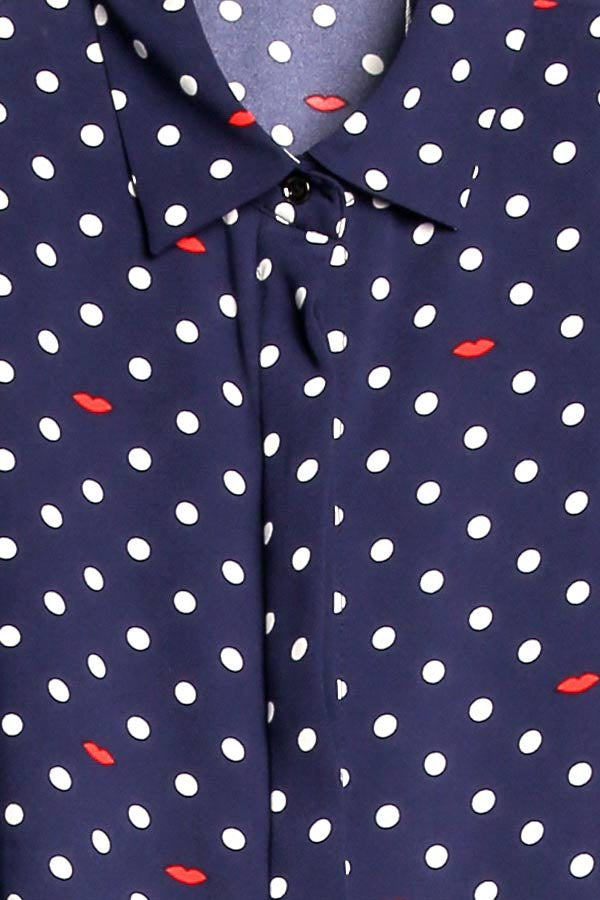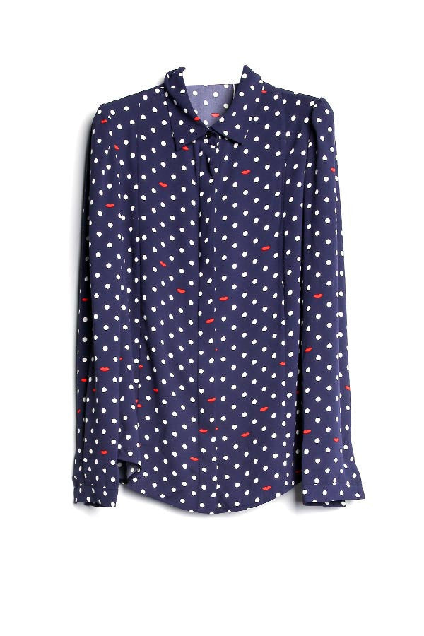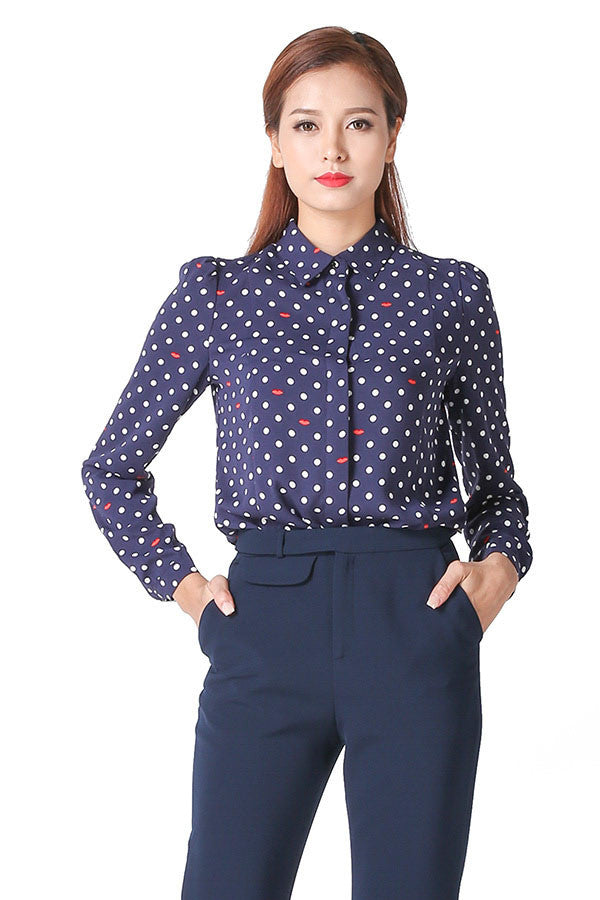 Áo sơ mi dáng suông họa tiết chấm bi được biến hóa trở nên hiện đại, cá tính hơn với 2 đường ly đối xứng kéo dài từ cầu vai xuống gấu. Phần vai nối tay áo được may hơi nhún bồng giúp những cô nàng có bờ vai nhỏ che được khuyết điểm một cách tài tình.